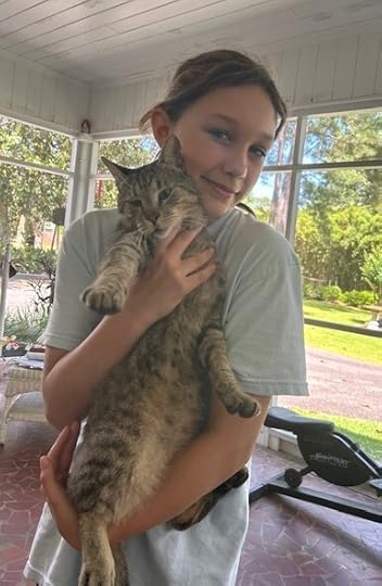 I noticed Dinji, our one-eyed gray cat, sitting at the foot of our “See Rock City” bird house. His body was tense, ready to spring, eying something above him. I couldn’t see anything he could be so interested in. All day, from time to time, he was right there intensely watching, his body in hunting mode. I wondered what he saw. A bird I hadn’t noticed? A lizard? I could see no movement around that bird house pole. Off and on, he took up his post, all but licking his chops. Even the next day, there he was, watching and waiting.