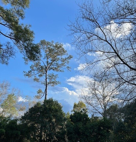 Without looking up I’d miss the breezes playing in the tops of pine and oak. I’d miss the orange and red trumpet flowers on the trellis at the library. And I’d miss the purple wisteria climbing amongst the reeds, lush as Caleb and Joshua’s grape clusters.