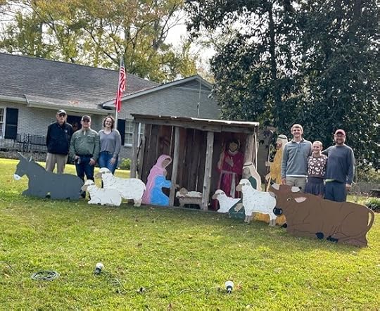 I sat on the front porch and watched as everyone worked to set up the scene the day after Thanksgiving. Thanks to the Lord’s mercy and a wonderful oncologist named Dr. Tan, Charles was a lot stronger and was able to supervise in a pretty hearty way. Our grandson, Charles Reeves, had helped put the stable together many times and was a team leader now in stable building. His wife, Allie Nowell Reeves, took a place holding a corner together while the screws went in. Also helping hold, heave, prop or whatever was needed were our son Will Graham of Birmingham along with two of his three children, William Jr., an Auburn sophomore, and Mattie, ninth grade. There was a lot of laughter and teasing, setting and resetting the roof, adjusting here, re-screwing there.