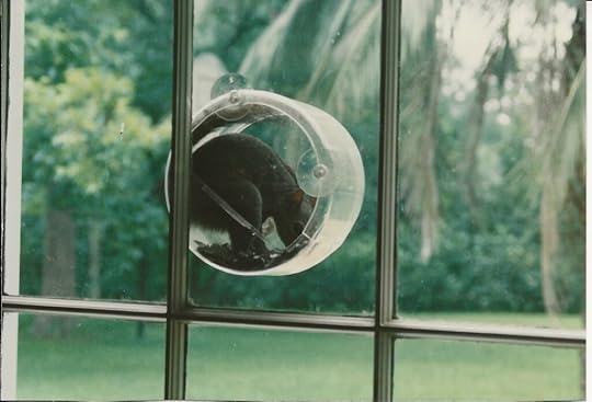 We greased a bird feeder pole, we bought squirrel proof feeders, we tried everything. Then we found the guaranteed squirrel proof bird feeder. It was a circular feeder of clear plastic open on one side, with suction cups to fasten it to a window. We put it on a dining room window where we could enjoy the birds eating while we ate. We could watch the birds up close without their being frightened. It was a delightful feeder. We saw squirrels eying it wistfully. They leaped to the window sill but couldn’t climb the glass. Over and over they tried. We thought we’d finally found the feeder only birds could enjoy.