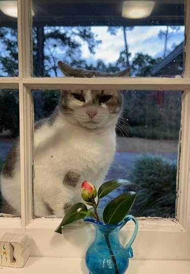 I’m always so glad when I open the kitchen window shutters in the morning and find our cat Bertha ready to greet me. We have three cats but Bertha is the one who senses the time is right and waits in the window ready with a cat smile. When I lay my fingers against the window she responds by rubbing the glass with her face or even a paw. When I blow her a kiss she answers with a fervent meow. She watches as I pull out a pan for cooking eggs, open the refrigerator to get milk and butter, and run water in a pot for grits. It’s as if our kitchen is her television and we’re stars on a show. Of course when she hears Dr. Graham open the back door she leaves the window pell-mell because she knows he’s going to feed the felines.