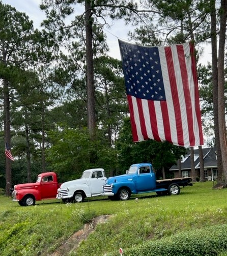 It does my patriotic heart good every time I see a flag unfurled, whether at an auto dealership, the post office, the courthouse or in front of private residences. We keep a flag flying high at our house, regardless of the time of year. I enjoy the sound of it playing with the wind and the energetic shadow it makes outside my office window. But one of the best flag displays I’ve ever seen is the Wootens’ pickup trucks and flag on the Barnetts Creek curve between Pine Park and Thomasville, Georgia. At the risk of being hit from behind we stopped and took a picture of the scene yesterday. Three pickup trucks–red, white, and blue–are parked between pine trees under a huge American flag.