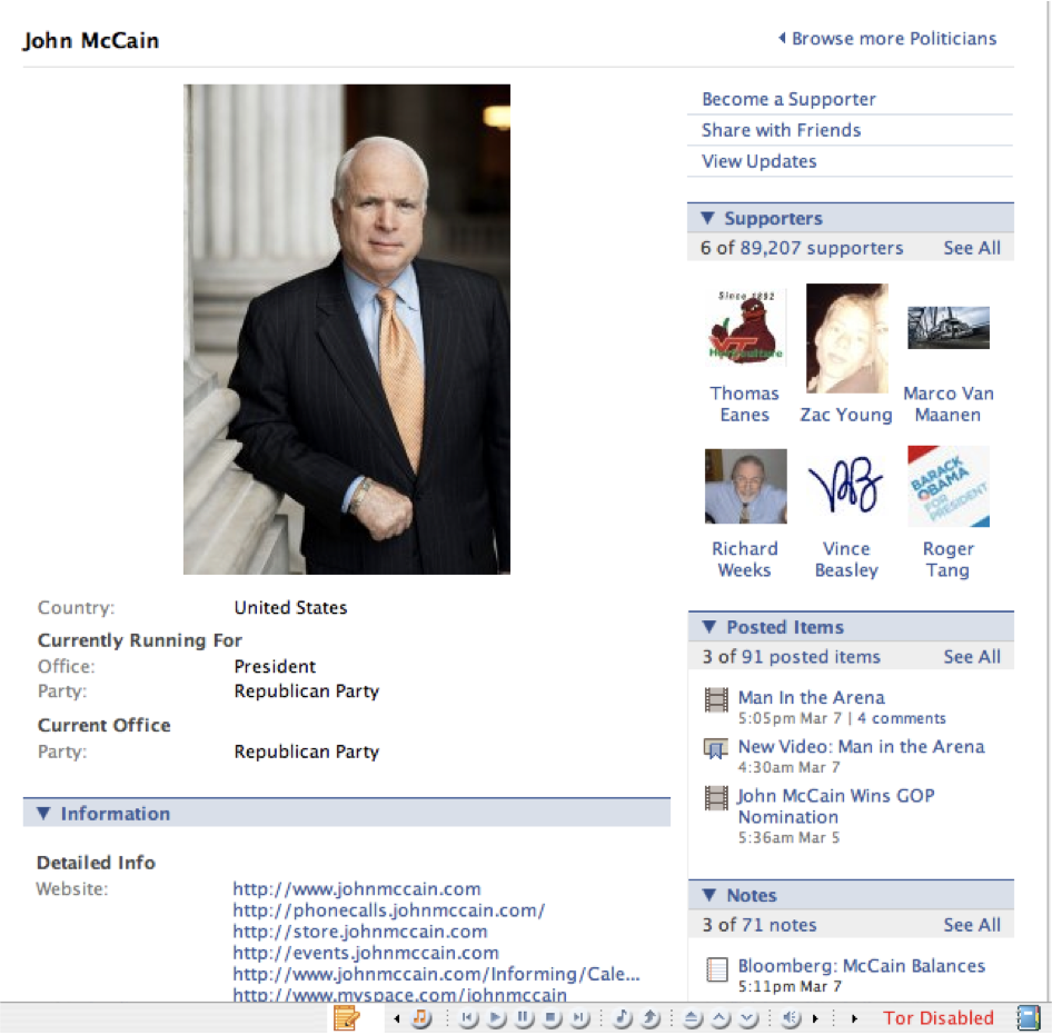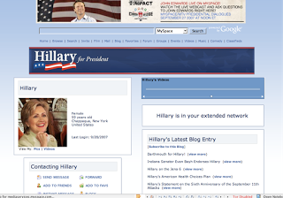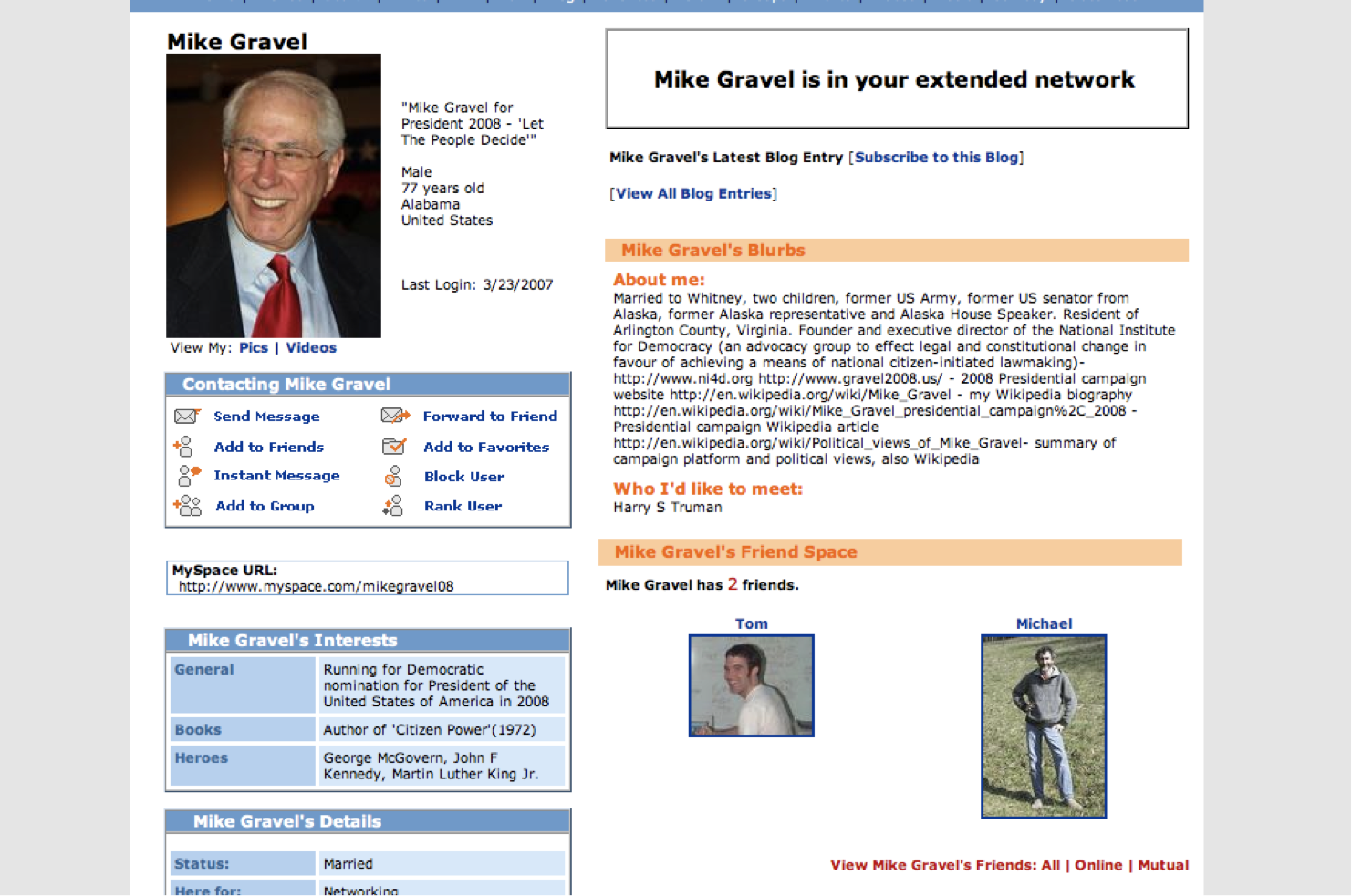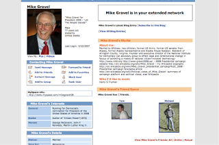 13. Find ways to advertise and market yourself. I spent a lot of time on this one, talking about the incongruity of social media and electoral politics. There is the weird feature of Hillary Clinton’s age and hometown being listed on Facebook, and Obama’s crazy link heavy pages on the site. We talked about the inherent conservativeness of Obama’s popular music and movie choices, and the weird MySpace page of Mike Gravel (remember him?), who had only two friends, the founder of MySpace (Tom Anderson) and his son.