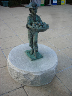 Johnny Appleseed Statue inside Leominster City Hall. This remarkable statue was carved from the trunk of a local tree, and eventually relocated inside City Hall to protect it from slow decay. The words at the base, “Sowing West,” almost became the title of my Johnny Appleseed book.