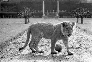 I love this photograph of Christian. He looks so handsome and cute. We took him to this garden every afternoon on the Kings Road, Chelsea. The studios in the garden were originally Sir Thomas More’s stables. It was peaceful, usually without people, and safely enclosed. We could relax. Actually it was a graveyard for the Moravian Church, a sect that bury their dead vertically. The vicar did not mind that Christian played there, until he got bigger and Christian one day took an interest in one of his visiting grandchildren. He reacted differently to children and we always had to be very vigilant. The fact that he was growing so quickly precipitated our need to leave London. Christian was not aware of it, but already at this size we could not have controlled him if we had had to. Bill Travers and Virginia McKenna built an enclosure for him in their large garden in the country at Dorking. That was where we waited long months for permission to take him back to Africa.
