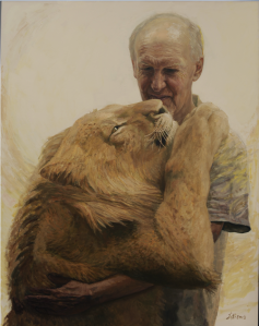 I think it is an excellent portrait of Christian with a very good likeness. It is based on “the Hug” which is on YouTube, which is Christian jumping up into my arms – his greeting for me as I entered the enclosure in Dorking. Jaiwei said he nearly went mad painting all the fur – which he did beautifully – and he hadn’t realised the fur on lions was so varied and individual!