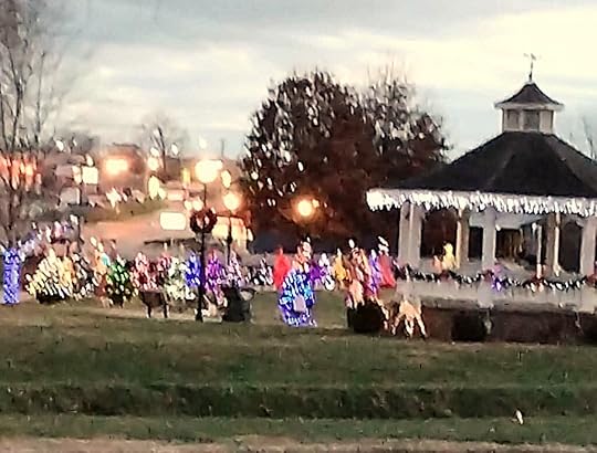 Our city park is so lovely this time of year. The gazebo is strung with white lights, festooned with pine garland and red bows. At one entrance a canopy of white lights arches across the bridge. The paths are lined with brightly lit trees, most in remembrance of those who were loved and lost. It’s a pretty park in all seasons, but at Christmas it becomes magical. Since the park is very near my workplace I walked over on my break, thinking to get some pics to share with you. As per usual with my pictures, every one of them came out blurry. (I have so much respect for you photographers