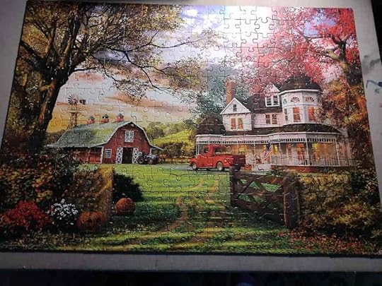 In a recent post I put up a pic of a puzzle I had done that featured a pumpkin farm, a red truck, and a big, white house. One of my readers commented on the house and the stories it could tell (Thank you, Dawna