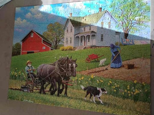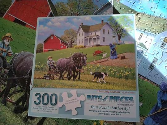 I finished this one, called ‘Planting Season,’ yesterday. Love the Amish couple, the beautiful horses, and the little red wheelbarrow. I see the dog also makes an appearance in this scene. Maybe the Amish couple and the farm wife are neighbors and the dog makes his rounds
