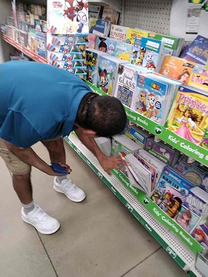 Wallet full of birthday money in hand, he searches for a new book for his collection!