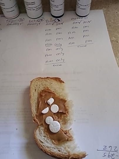 I know the peanut butter is not ideal, especially given her weight gain, but believe me, the little sandwich is the only way to get these pills into Miss Emma. Thankfully one is only for four days, and one is for five.