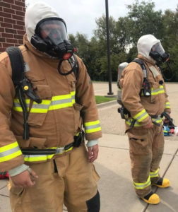 We’ve been taught how to properly don (and doff) all our PPE (Personal Protective Equipment). There’s a bit of art and a bit of science to this process. And of course you can’t take all day to “get dressed” – I believe we have to do it in under two minutes to pass the final test. (I’m not there yet! But I will say this: I cover every step methodically. I’d rather take an extra 30 seconds to make sure I’m fully protected before charging into smoke and fire!!)