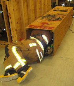 My department got brand-new SCBA in May, so I’ve got the “coolest” harness and oxygen tank in the class. However, it comes with a drawback: it’s also heavier! It’s a 45-minute tank vs the 30-minute tanks my classmates have. It’s also bigger – so the photos below where we’re trying to crawl through a small space? It’s gonna be a bit harder for me!