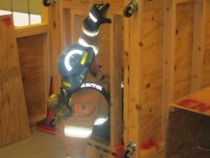 At right: Ever have to knock through a wall? I’m sure we’ll get to that part! But for now, they had us maneuvering our body + 40 pounds of gear (thankfully we didn’t have to wear the face mask) through a width typical to the space between wall studs (16 inches).