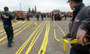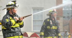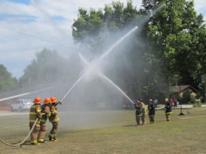 In my opinion, the third guy/gal has the toughest job. S/he has to move the bulk of the hose back/forth as the match goes on, and believe me, it’s hard to keep that much hose from kinking up (a couple times it ‘pinched’ my gloves so I couldn’t move my hand). AND they are the main “direction giver” because they don’t have so much water in their face.