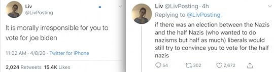 Of course you should choose the thing that is twice as good. You should buy the car that is twice as good, rent the apartment that is twice as good, take the job that is twice as good. When we’re deciding about a car, apartment, or job, we can do that math, but, when it comes to politics, suddenly people can’t see that half a fascist is twice as good as a full fascist, let alone whether Biden is half a fascist.
