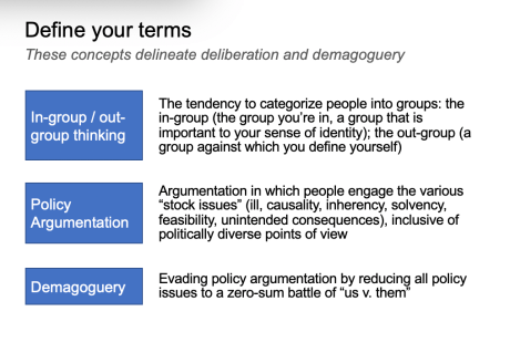 We are, once again, at a moment when people are calling for civility. My persistent complaint about American “political” discourse is that it is so rarely policy argumentation. Policy argumentation requires that participants argue (not just make assertions) on seven points: there is a need (aka ill), it’s serious, it won’t go away on its own, here’s what causes it; here is my plan; my plan will solve the need I identified, my plan is feasible, and my plan won’t cause more problems than it solves. American “political” discourse usually involves people arguing need and how it’s serious and then asserting a plan, and not even touching on the other points. (If that—sometimes they just assert need and engage in fear-mongering about it being serious.)