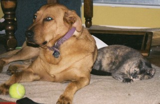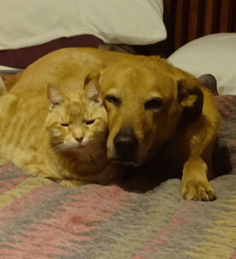 He went from being grumpy about other beings to allowing a cat, Winston Churchill (who fawned on Marquis–they do say that Churchill was a bit of a Francophile), to eat out of his bowl and to snuggle with him.