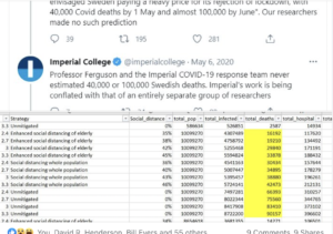 Almost exactly 1 year ago I wrote an article on how a team of researchers at Uppsala University had adapted Ferguson’s UK model to Sweden, and yielded preposterous results – e.g. a prediction of over 90K dead if they did not go into lockdowns. My article made waves over in the UK, and Ferguson himself was grilled about it in testimony before the House of Lords. This caused Imperial College to fire off a bunch of tweets and statements disavowing any connection to the Uppsala adaptation of their model. It wasn’t their product, they insisted, and Imperial itself had never claimed between 40-100K deaths would result in Sweden