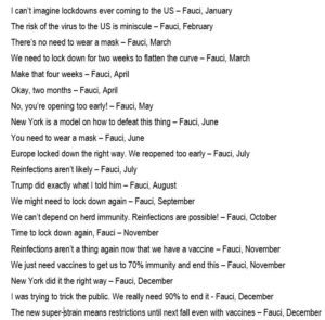 Official lying about things large and small has been a staple of Covid politics: the letters to college students threatening them with arrest if they don’t quarantine, the interstate travel “bans” that were never enforced, the death counts that swept up anybody who died of any cause while infected with Covid.