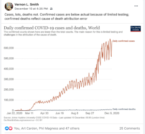 You’re unhappy with my linking to a December 10th Facebook post by Nobel-laureate economist Vernon Smith – a post in which Vernon shares a graph, from Our World in Data, comparing the number of daily Covid-19 cases to the number of daily Covid-19 deaths. Observing that the former is magnitudes larger than the latter, Vernon comments in his post: “Cases, lots, deaths not.”