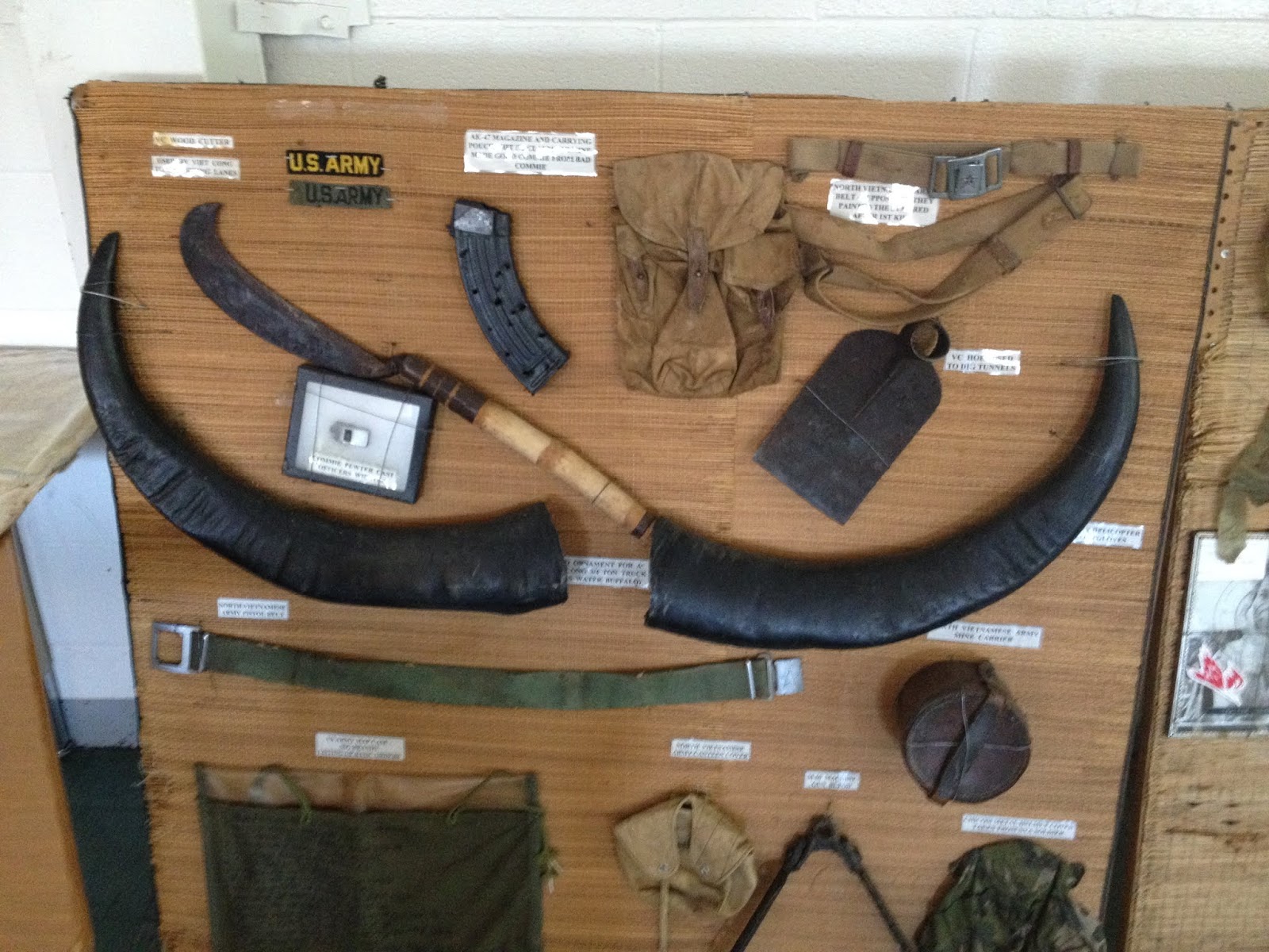 That’s the big stuff. Inside the building, dozens of display boards exhibit assault rifles, knives, banana clips, rocket-propelled grenades, helmets, badges, battle flags, and clothing. One board is devoted to business cards from nightspots like the Princess Bar, 140 Tu Do Street of Saigon, featuring Attractive English Speaking Hostesses and Cold Drink at Moderate Prices. The displays trigger conversations in this crowd of vets and family members. Many of the boards feature American and “Commie” gear hanging side by side. “All this VC gear makes me scared to come in here at night,” jokes Ron Petty, who in 1967 was a warrant officer pilot. Here's one of the display boards: