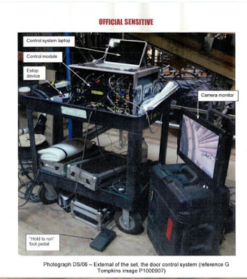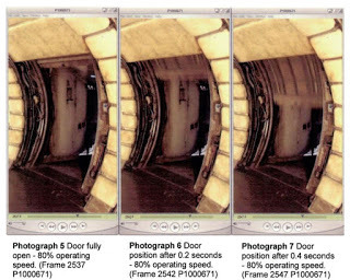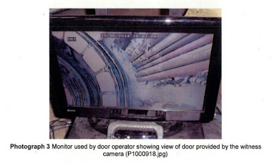 The problem: the door operator was primed to close the door. But he was able to see the doorway only with th video camera feed, which was now zoomed in on the dummy door button. He'd seen Ford hit the dummy button, but with the tighter camera angle, he couldn't see that Ford had turned to come back through the doorway on his way down the ramp.