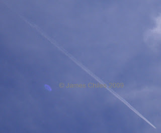 I was taking a photo of the contrail and didn't notice the Ring until months later, when flipping through the photos. Here's a wider view, then a cropped shot, enhanced with some contrast: