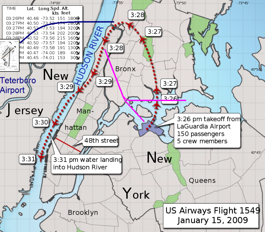 During the fifteen months between the ditching and the final report, simulator trials showed it would have been barely possible to get back to the airport, but only if the crew had executed the return without any pause to sort out what had happened. (Illustration from https://en.wikipedia.org/wiki/US_Airw...)