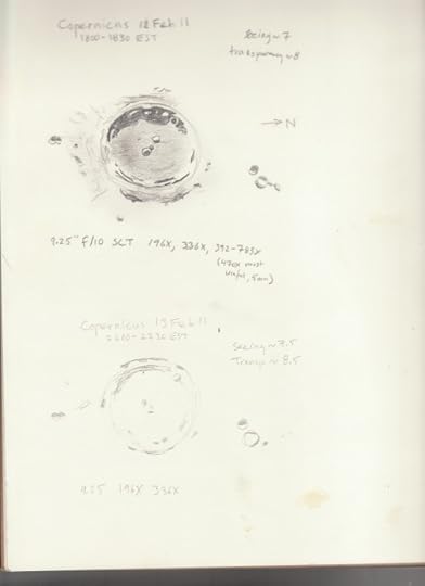 I don't really have the patience or the velocity to be a good lunar artist (the appearance changes sometimes minute-by-minute under high power), but I do enjoy sketching anything. Here are pictures of the crater Copernicus on two consecutive nights. On the 12th, the sun was at a low enough angle to reveal a lot of shadow detail. On the 13th, 28 hours later, it's getting close to local noon, and the details are washed out. Hope I'll be able to take another look tonight.