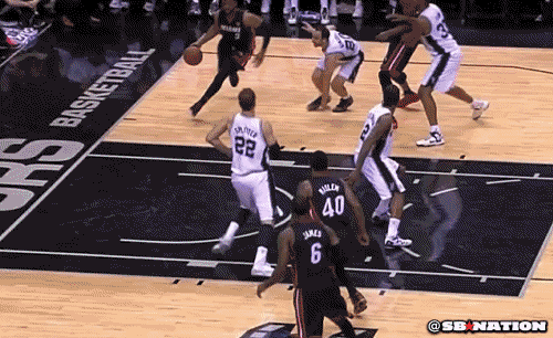 Wade drives and tries a dunk on Splitter. HUGE block by the man James swatted in epic fashion during in last year’s finals. Call it “Splitter’s revenge.”