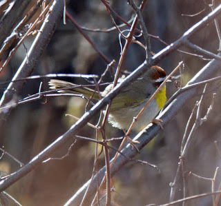 Day 2 south of Tucson involved the trek up Florida Canyon. The trial is pretty good until the tank and then by the dam, it is a couple steps short of bushwacking and after 1/2 of a mile of thorns etc. my arms looked like I was having a fight with a cat. We hiked up prior to a pending storm and pretty much all was silent until we reached as far as we could go...would we find the rufous capped warbler?