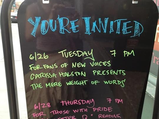 And my last bit of news is particularly thrilling because it’s making me hyper about my book. The latest issue of Shelf Unbound came out yesterday and, in it, Marc Schuster had done a write-up on novellas for Novella Month. The Mere Weight of Words was among them. Here’s what he had to say, “With smart, inventive wordplay, Halston explores the veracity of language, and ultimately, of love. More, please, Carissa Halston.” You can read the entire issue here. And, as a gentle reminder, you can pre-order copies of Mere directly through the publisher (signed copies will be available only during pre-order) or attend any of the tour events, where I’ll be happy to sign a copy for you in person.