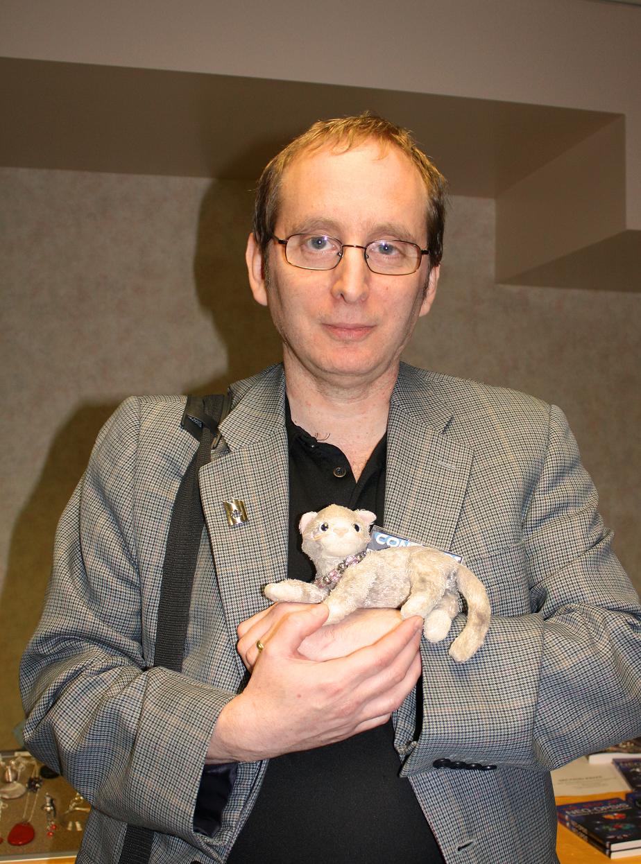 I met Vanessa and Toulouse in the hotel lobby. Toulouse—cool cat that he is—pointed out the espresso machine behind the front desk and winked. I ordered a double shot of the strong brew and watched Toulouse down his single shot (a lot for a small stuffed cat) in three major inhales. If he was a SIM he would have shivered with elation and uttered the SIM word for "Arriva!" What an auspicious start to Montreal's annual science-fiction and fantasy convention!
