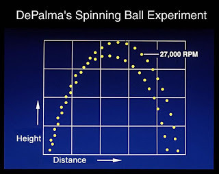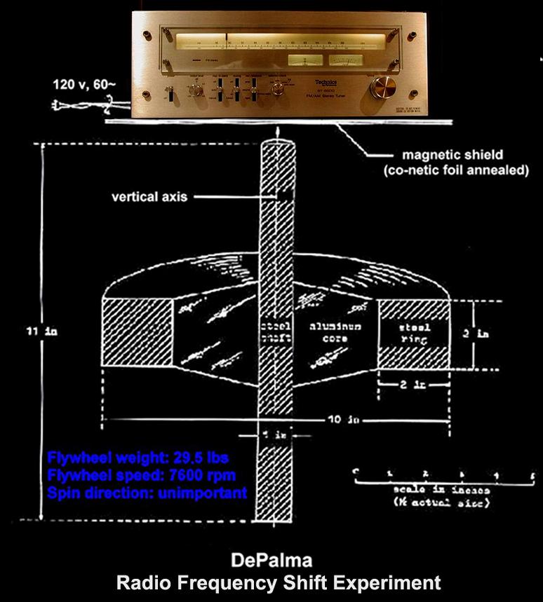 DePalma's experiment with steel balls in 1972 showed that certain physical properties of an object are radically altered—both its mass and inertia—if it is rotated. According to DePalma, rotation produces a force field, specifically around the main axis of the rotating object, that he measured and called a torsion field or spin field. Time-lapse stroboscopic photographs revealed that the steel ball rotating at ~27,000 rpm flew higher and fell faster than the companion ball that was not rotating. DePalma had since conducted experiments on "bodies in rotation" including massive objects (e.g., over 30 lbs), spinning at very high velocities (~7600 revolutions/minute).