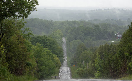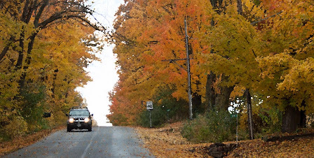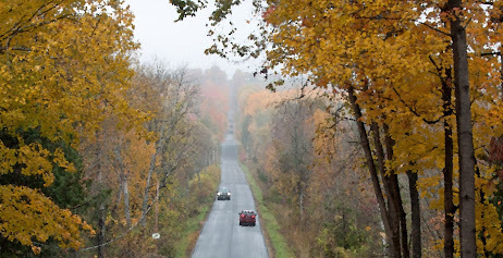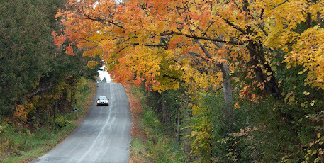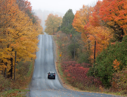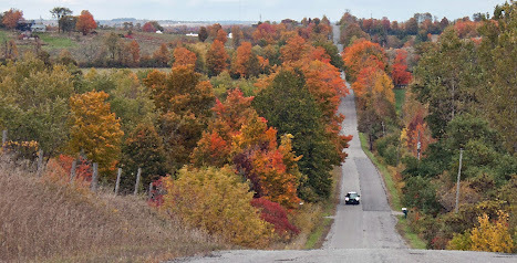 Soon, I was driving along one of my favourite country roads, a gently rolling barely paved road through forest and farmland that rose and fell over drumlins and eskers with views that make you sigh. A vibrant carpet of orange-crimson forest and copper-hued fields covered the undulating hills in a patchwork of colour.