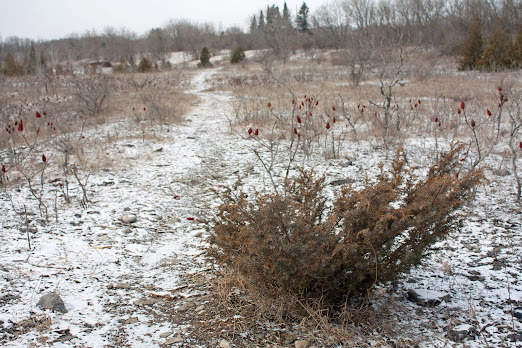 The meadow that stretched before me was a gently rolling landscape of pale gold grasses and a chaos of strewn limestone rocks and gravel dotted by russet junipers and the gray-brown umber of dwarf hawthorn, buckthorn and sumac shrubs. In a lower depression in the centre of the meadow, a grove of young cedar trees added splashes of green to the gold-copper mosaic.