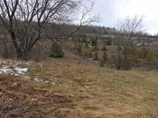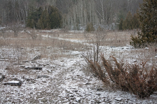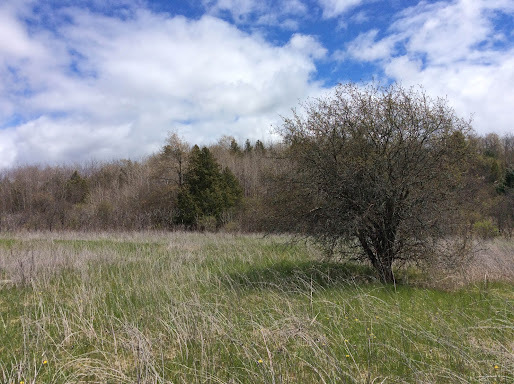Given the role of disturbance in the formation of alvars, I studied the lower ‘bowl’ of the meadow more closely for signs. An old structure may have once stood where semi-structured rock piles were arranged to form a square. A patch of young cedars and birches—both flood-tolerant—surrounded it. I’d seen this same successional phenomenon in the Trent Nature Sanctuary, where it had been previously farmed. At the southern rising edge of the alvar stood a farmhouse, accessed by the little minor road I’d crossed earlier on the trail. I considered that this alvar was dominated by early sere plants, often the first to colonize a disturbed environment—lilac, hawthorn, buckthorn, sumac. Had there been a fire through here? Had someone tried to cultivate this site? It was surrounded by rural and residential development with a dedicated parkland (Trent Nature Sanctuary) of a drumlin maple-beech forest bordering it to the east. Attempts to cultivate parts of the nature sanctuary at one time are also evident.