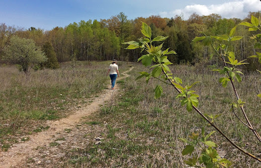 Then, at a set of rocks on the east side of the trail, the thicket opened to a grassy rise and I glimpsed a small path, leading up the rise. The path was more like a depression in the grass where repetitive footfalls had created a trail of sorts. Several mature buckthorns and willows dotted the crest of the rise. And beyond the crest … well, that was my question. What lay beyond it? From my current position I could only make out the possibility of forest in the distance. The main trail up to this point had been through forest scrub of sumac, dogwood, black locust and other shrubs dense enough to obscure what lay beyond them.