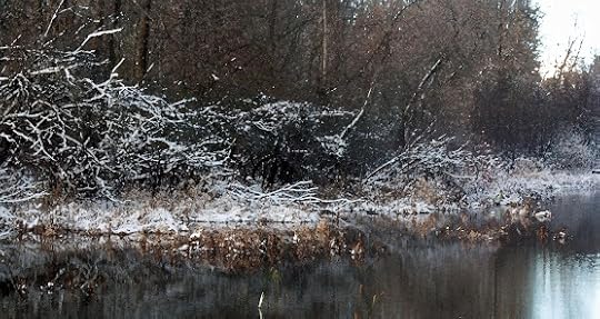 It started with a sudden hail then light snow followed by sunshine. But even as the sun shone, more snow fell. The stubborn river kept glinting in the sunlight. Huge flakes fluttered down and the river sparkled. Some trees lit up like torches behind the thick snowflakes.