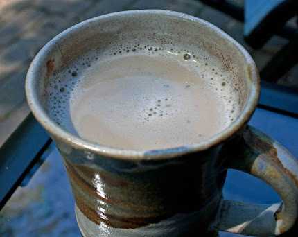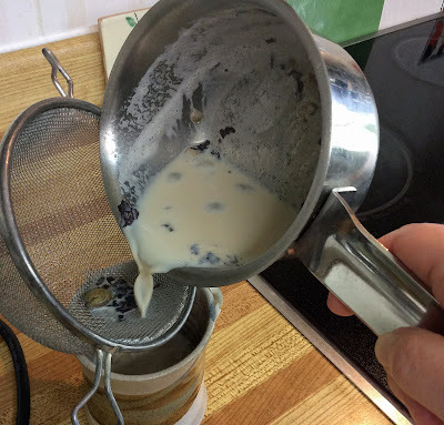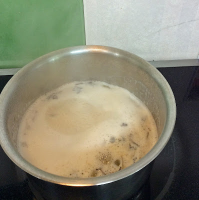 Add milk to the boiling tea. Wait for it to boil. It will rise up into a froth. Simmer down for several minutes. Then strain into a cup and drink while wonderfully hot.