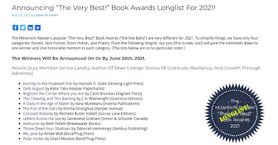 The Miramichi Reader's popular "The Very Best!" Book Awards were recently announced for 2021. Nina Munteanu's climate fiction novel "A Diary in the Age of Water" is one of twelve books chosen for best novel. Winners will be announced on or by June 26th, 2021.