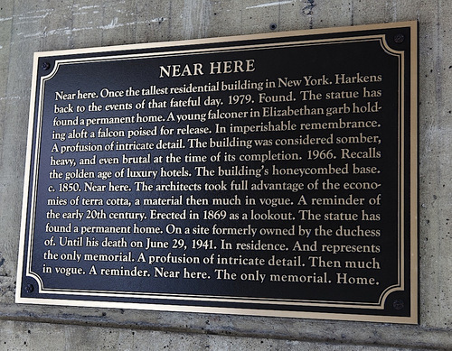 THE DAILY PIC, Whitney Biennial edition: Biennial artist Paul Druecke collaborated with poet Donna Stonecipher on this wall work, which sits by the little bridge that links the Whitney Museum to the rest of New York. It captures the language of commemorative plaques that we place here and there across most of our cities, as we testify to the histories that we live among and that risk being lost to us. (I recognize the “falconer” line from the plaque on a Victorian statue that I jog by in Central Park, and the “somber, heavy, and even brutal” passage is boilerplate that refers to the Whitney itself.) By providing a mash-up of so many separate commemorations, Druecke and Stonecipher distill out a poignant, generalized sense of our efforts to preserve memories. When we put up any plaque, they seem to be saying, the act of erecting it matters as much as the information it bears. This Whitney work, you could say, is a plaque that commemorates all our other plaques. (Photo by Lucy Hogg)