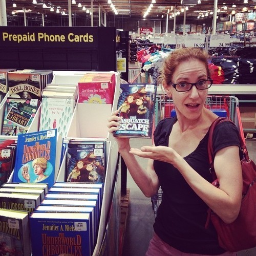 Observe as my model wife displays copies of #TheSasquatchEscape at Costco.