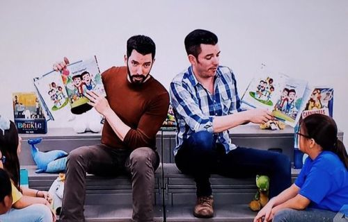 Well, this is cool. My wonderful agent, @jodiesque, was watching The Kelly Clarkson Show, and the Property Brothers (Johnathan and Drew Scott) were on and they were rebuilding a library in Houston courtesy of Kohl’s and they just so happened to be sitting with my books and dolls!