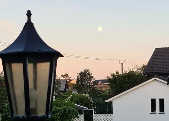 No walk this morning. Just a tour of the bushes in the front yard. The moon looks full, although technically waning. From this past week, I’ve learned to tell the time this time of year by the moon’s journey past the light post, over the shed, and across the street to just touch on the top of the nursing home’s roof. Midnight. Two. Three.