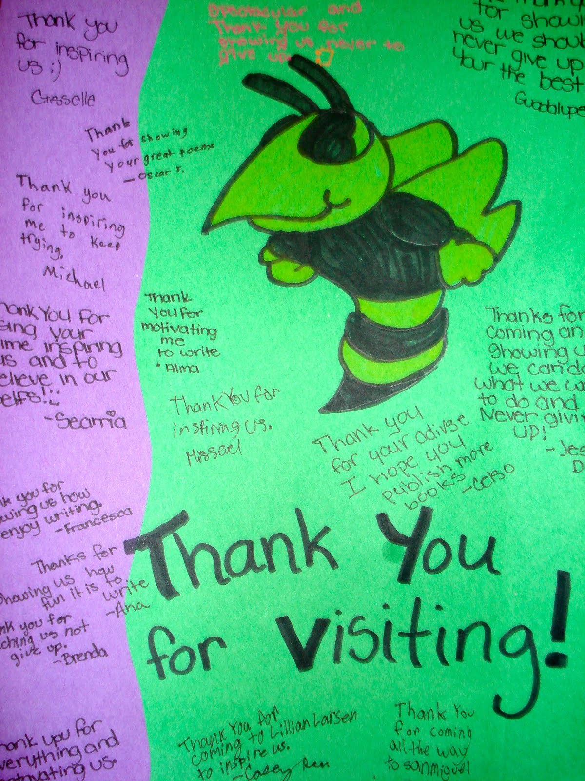 Thank you for taking time to share your passion with children who truly need it the most. After talking with the other teachers, the only way we can describe how our students reacted was magical. I have never seen so many students here take pride in what they have written. I sincerely hope you find time next school year to pay us a visit.