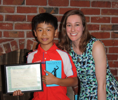 Everyone applauded, the young writers blushed, and then it was time for them to strut their stuff. One by one, I called them to the front of the room to read from their pieces that were published in the book. One by one, they shyly made their way to the front of the audience, and read their pieces out loud. As they soaked in the audience's enraptured attention, each young writer seemed to visibly grow in size: postures became straighter, voices became louder and more expressive. When they finished, after the audience cheered and I presented each one with a certificate and the parents became paparazzi taking a barrage of flashing photographs, I watched as each young writer walked proudly back to their seat -- walking a little taller, with much more confidence and joy. So different from the nervous, uncertain people who had walked up to the front of the room minutes before.
