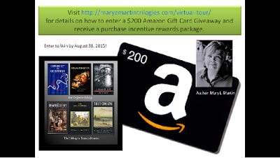Followers of the tour have an opportunity to enter in a $200 Amazon gift card giveaway! Entries will be accepted until midnight on August 31, 2015 with an announcement of the winner posted from Mary's Blog on September 1, 2015. Anyone submitting a proof of purchase entry in the giveaway draw will receive as an added benefit the tour purchase incentive rewards package of free e-books and discount coupons donated by tour hosts. For a full tour schedule of events, as well as details on how to enter, visit Mary E. Martin at http://maryemartintrilogies.com/virtual-tour/
