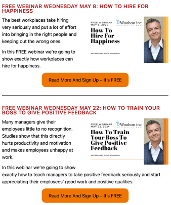 We have two super interesting free webinars on happiness at work in May: